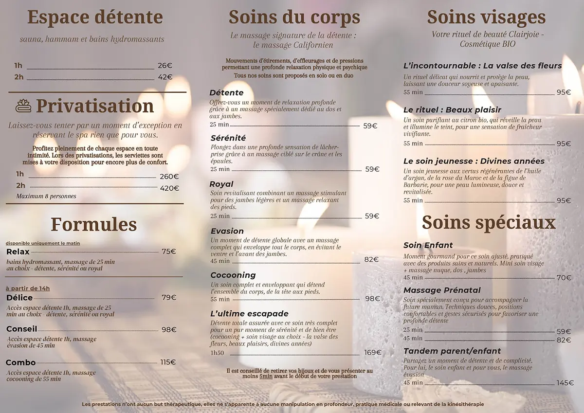 Équipé d'un sauna, d'un hammam et de 2 bains à remous, le cadre est chaleureux, l'ambiance est apaisante et vous pourrez déguster thés et tisanes qui vous seront offerts lors de votre séance.